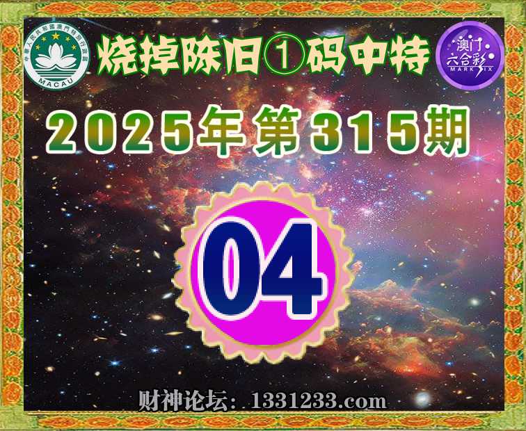 315期:【烧掉陈旧】 🚡①码中特🚡【04】开:04准